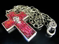 A stunning mix of red Swarovski crystals arranged around a skull set on a cross shaped pendant. This one's very sparkly!