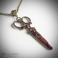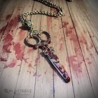 Necklace features a pair of large scissors covered with blood splatters and congealed blood effect.