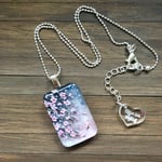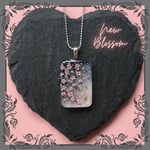 This pendant features an array of blossom set against a delicate shaded grey to pink ombre background. Tiny flecks of glitter add some extra sparkle to catch the light.