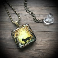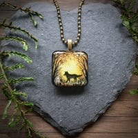 A smooth full resin pendant featuring a fox in a forest dell, set against a pale orange/khaki sky.