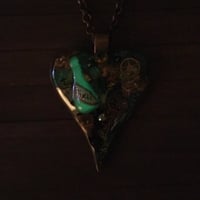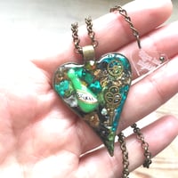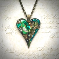 With a nod to the colourful decor of the Emerald City, this pendant features a collage of mixed media set in a bronze wild heart pendant. A glossy topcoat of resin adds depth to mimic a dichroic glass appearance.