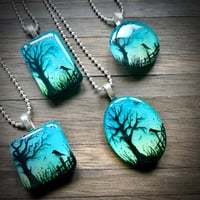 Features a hand painted tree in a field set against a multi-layered green and turquoise twilight starry sky. A crow or raven sits on a fence watching the changing night sky! Tiny flecks of glitter add a subtle sparkle and shimmer as your pendant catches the light.